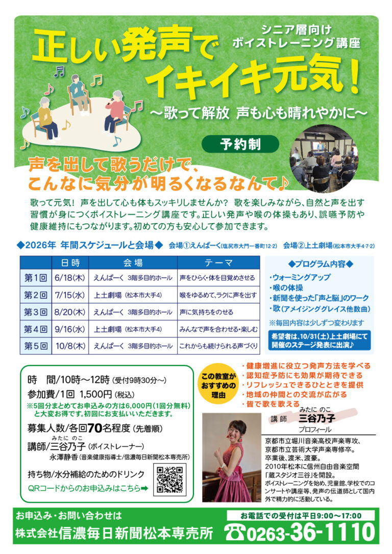 正しい発声法で健康増進、誤嚥性肺炎予防や認知症対策にも役立つシニア層向けボイストレーニング教室です。
